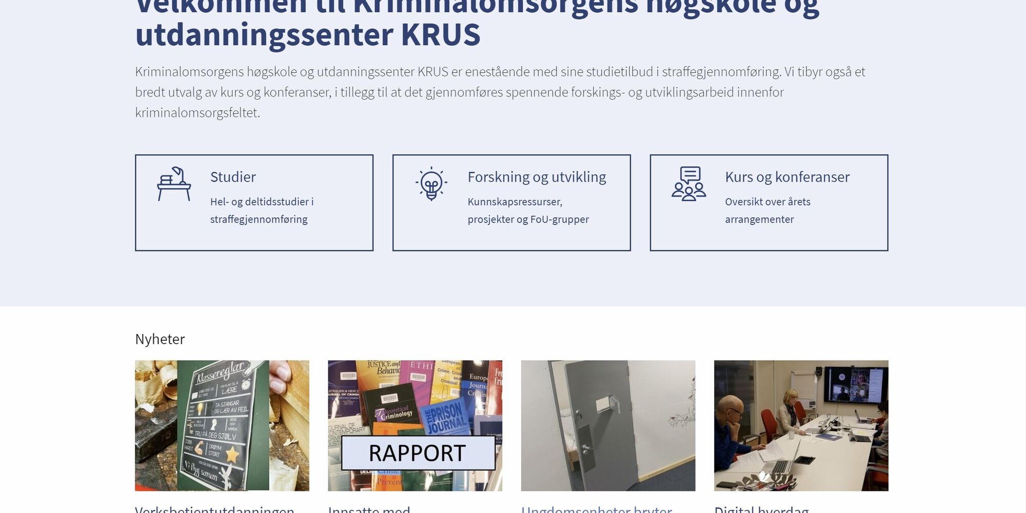 Sidene om studiene og kurs- og konferansevirksomheten vi tilbyr, har fått nytt design. Samtidig med dette arbeidet, har vi benyttet anledningen til å få på plass noe vi har ønsket å fremheve mer enn tidligere, nemlig egne sider der vi presenterer forsknings- og utviklingsarbeid. Her er det mulig å se nærmere på en rekke av de prosjektene våre ansatte for tiden er involvert i, samt en del kunnskapsressurser vi har utviklet, i form av f.eks. nettsider og håndbøker om ulike tema. Alle disse kunnskapsressursene har dermed blitt lett tilgjengelig for alle som er interesserte i kriminalomsorgsfaglige tema, uavhengig av om de jobber i etaten eller ikke.